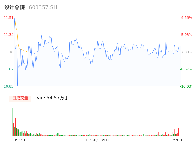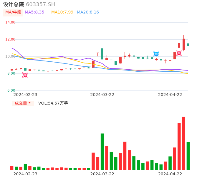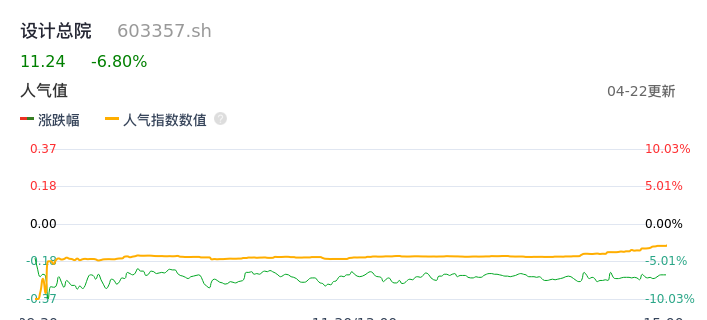 04月22日,设计总院收报11.24,股价涨幅-6.80%,成交金额6.11亿元,换手率10.00%。