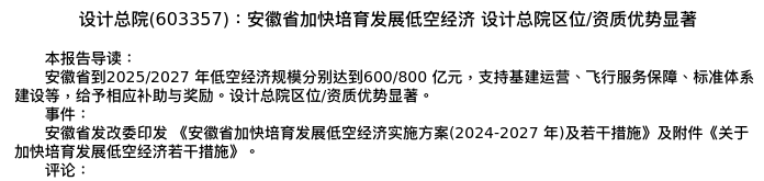 值得注意的是:2024年04月国泰君安的韩其成/陈剑鑫/郭浩然分析师,首次发布关于设计总院的研究报告,标题为:设计总院(603357):安徽省加快培育发展低空经济 设计总院区位/资质优势显著。