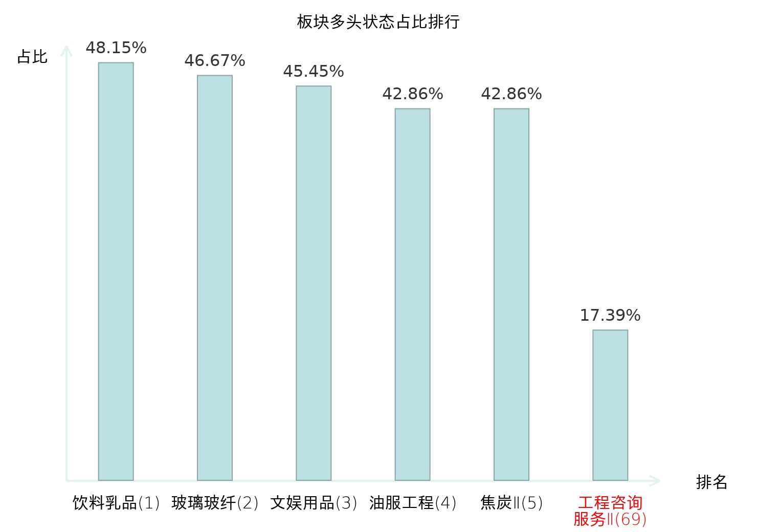 全市场所有行业板块中主力多头状态占比排名中,饮料乳品板块位居第一。商用车板块名次提升最快,较昨日上升77位。