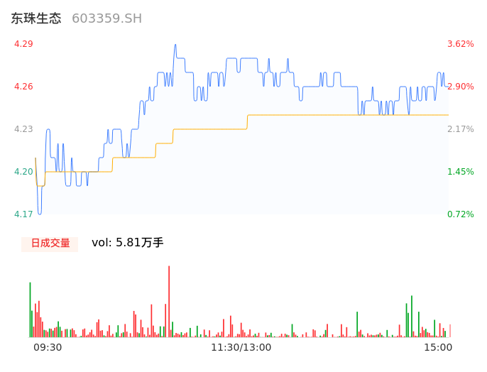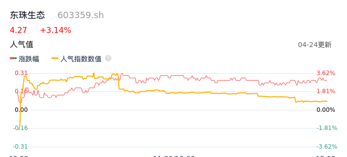 04月24日,东珠生态收报4.27,股价涨幅3.14%,成交金额2463.09万元,换手率1.30%。