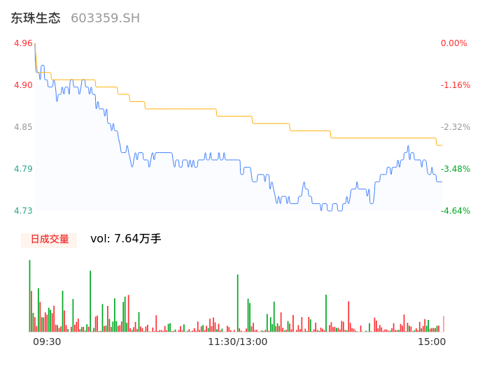 04月10日,东珠生态收报4.78,股价涨幅-3.63%,成交金额3687.76万元,换手率1.71%。