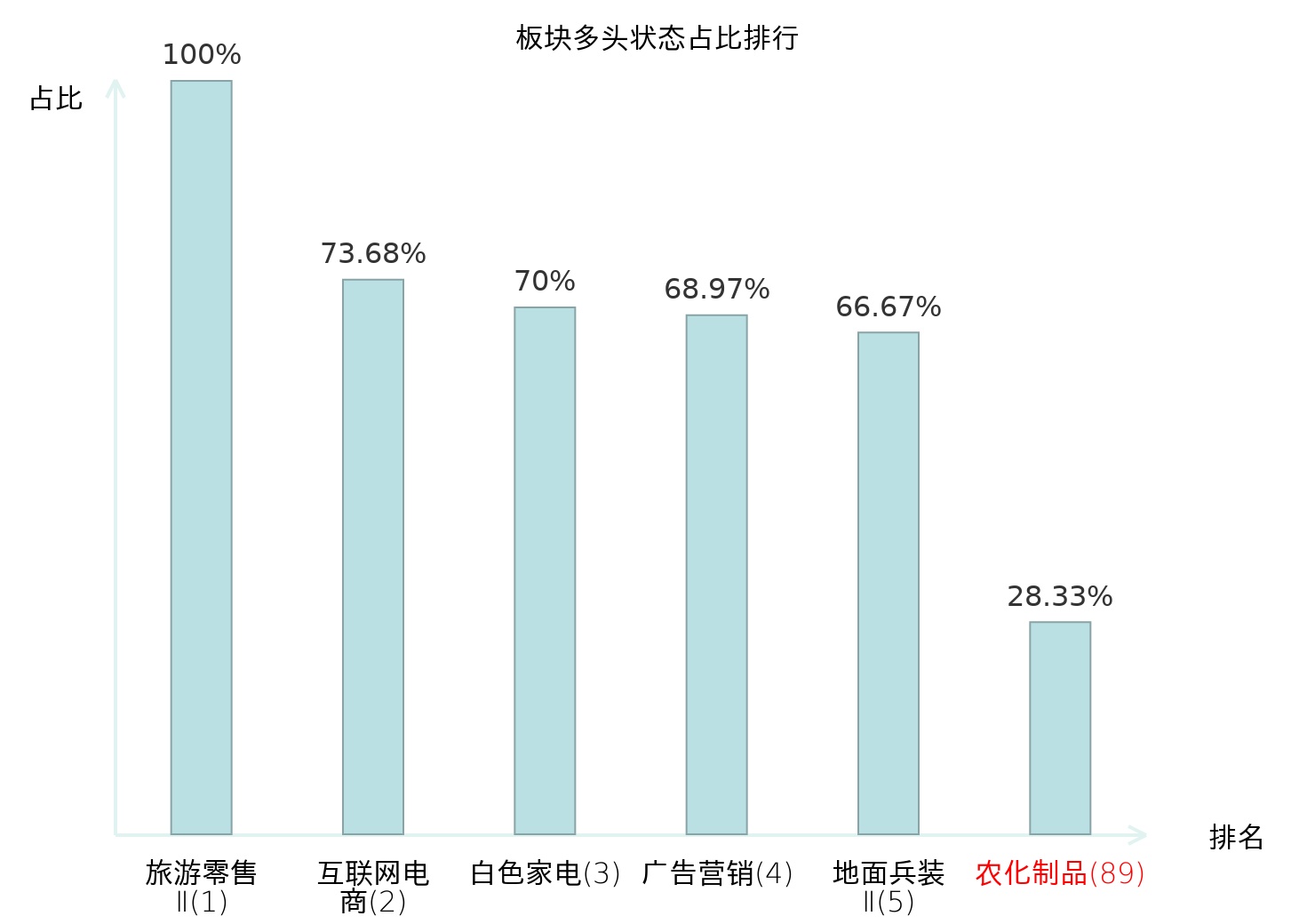 全市场所有行业板块中主力多头状态占比排名中,旅游零售Ⅱ板块位居第一。厨卫电器板块名次提升最快,较昨日上升76位。
