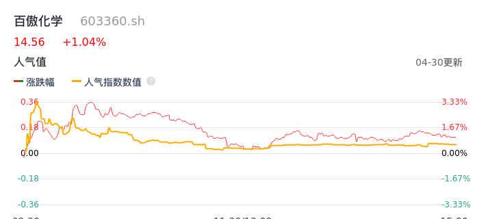 04月30日,百傲化学收报14.56,股价涨幅1.04%,成交金额8205.84万元,换手率1.56%。