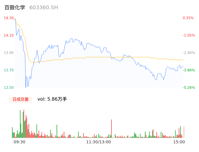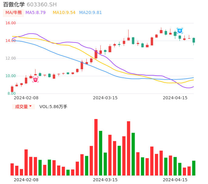 04月15日,百傲化学收报13.80,股价涨幅-3.16%,成交金额8093.38万元,换手率1.64%。