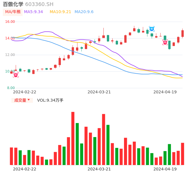 04月19日,百傲化学收报14.95,股价涨幅5.73%,成交金额1.37亿元,换手率2.61%。