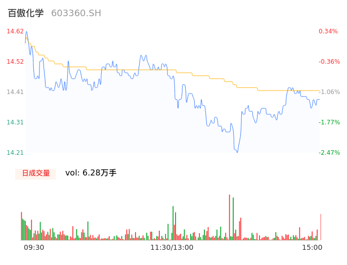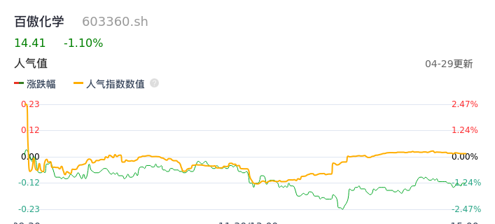 04月29日,百傲化学收报14.41,股价涨幅-1.10%,成交金额9059.47万元,换手率1.76%。
