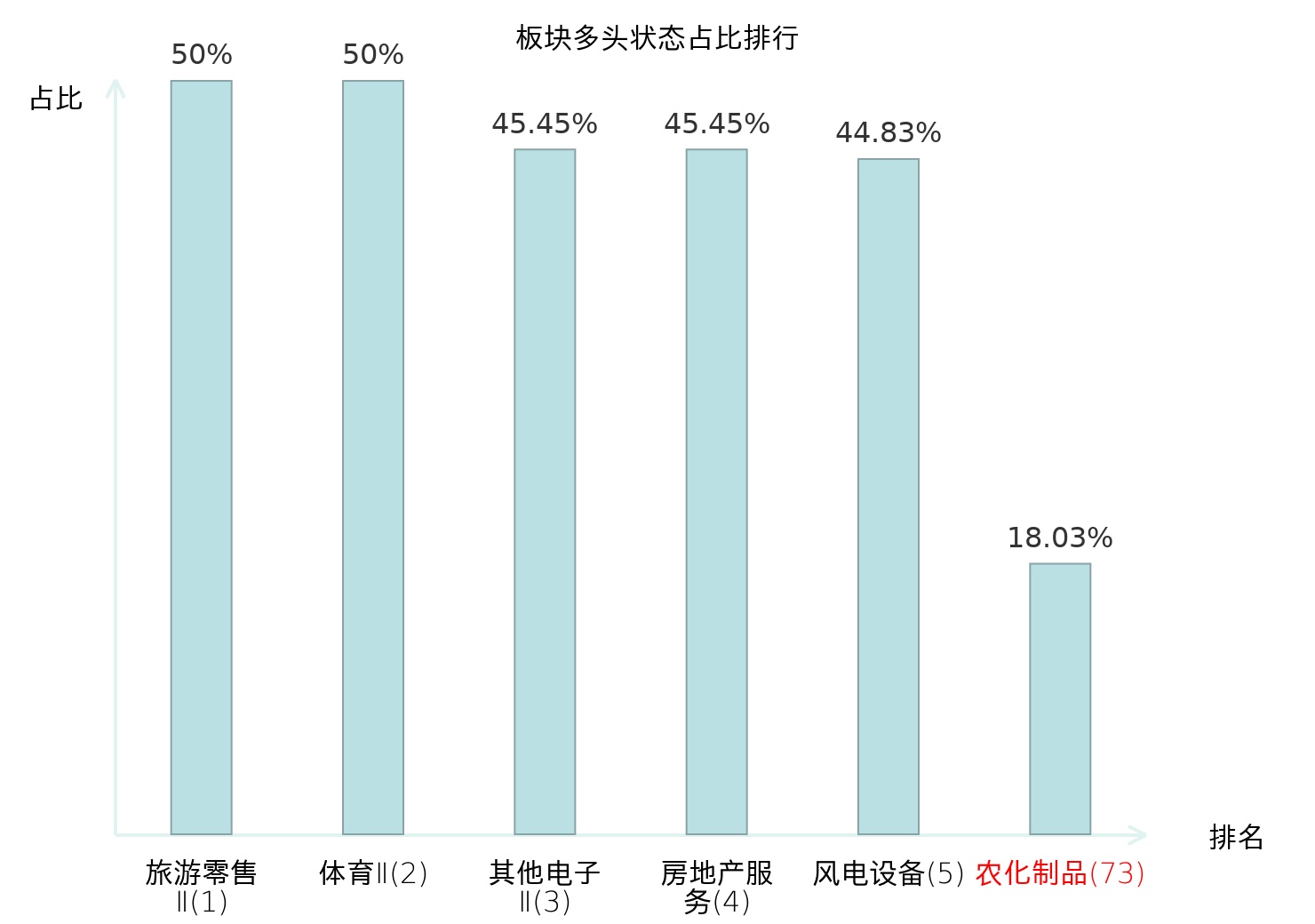 全市场所有行业板块中主力多头状态占比排名中,旅游零售Ⅱ板块位居第一。其他家电Ⅱ板块名次提升最快,较昨日上升112位。