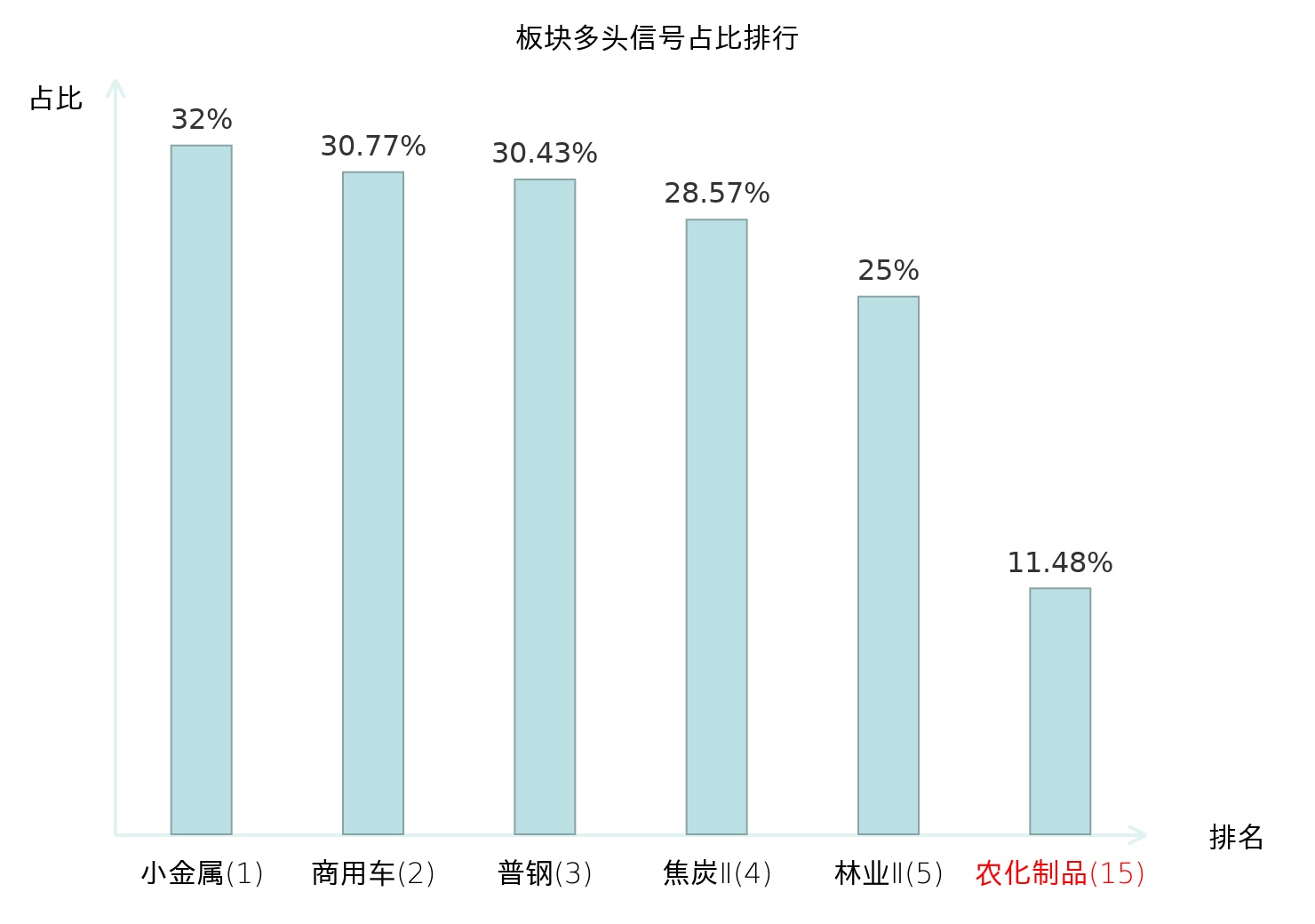 全市场所有行业板块中主力多头信号占比排名中,小金属板块位居第一。林业Ⅱ板块名次提升最快,较昨日上升121位。