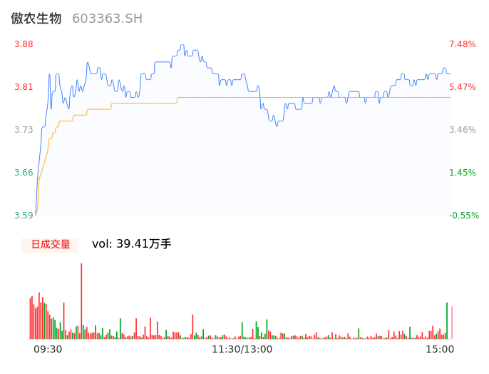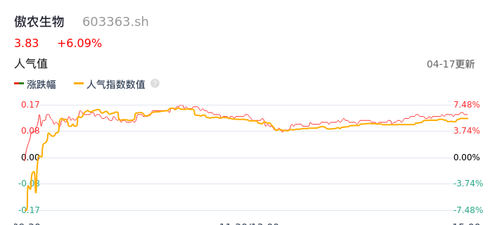 04月17日,傲农生物收报3.83,股价涨幅6.09%,成交金额1.50亿元,换手率5.34%。