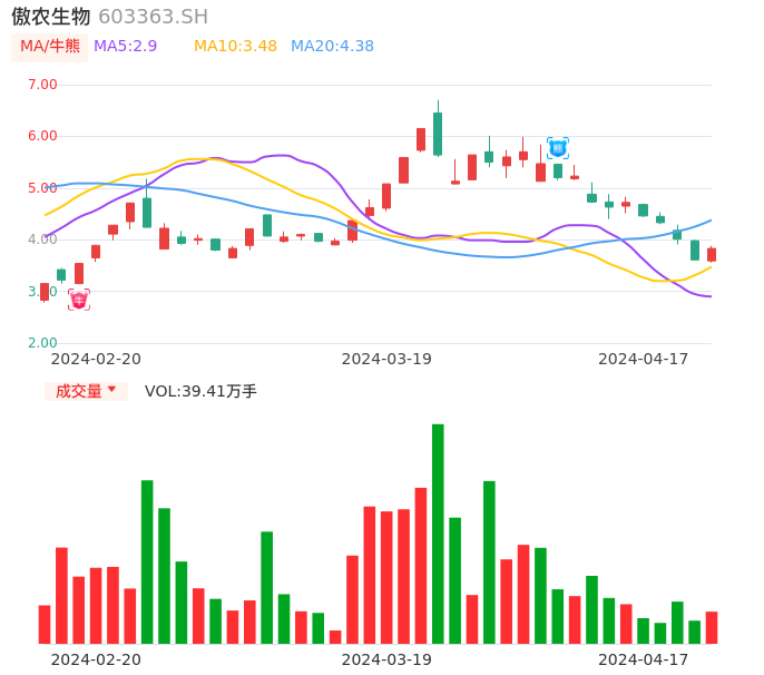 傲农生物在4月2日出现日线级别熊点,从熊点信号发出到今日10日内累积跌幅已经达到26.35%,股价近期跌幅巨大,KD指标数值为:10.05,已经出现超卖信号,短期套牢盘严重,如后期60分钟周期由熊转牛且基本面/消息面未发生重大变化则可能弱势反弹。