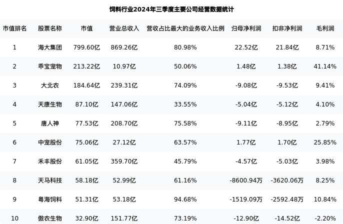 傲农生物最新报告期数据为三季度,下表汇总了饲料行业内市值靠前的公司三季度主要经营数据
