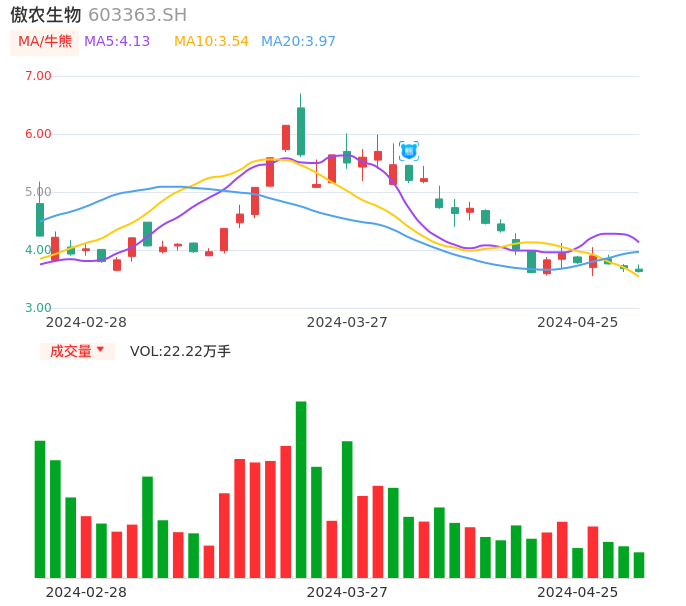 04月25日,傲农生物收报3.63,股价涨幅-1.36%,成交金额8157.65万元,换手率3.01%。