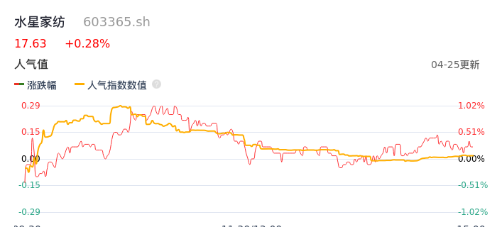 04月25日,水星家纺收报17.63,股价涨幅0.28%,成交金额2167.05万元,换手率0.47%。