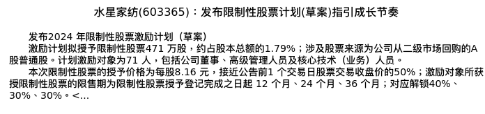 值得注意的是:2024年03月天风证券的孙海洋分析师,首次发布关于水星家纺的研究报告,标题为:水星家纺(603365):发布限制性股票计划(草案)指引成长节奏。