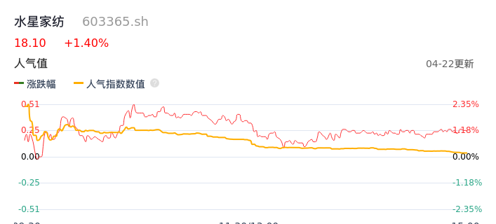 04月22日,水星家纺收报18.10,股价涨幅1.40%,成交金额3858.86万元,换手率0.81%。