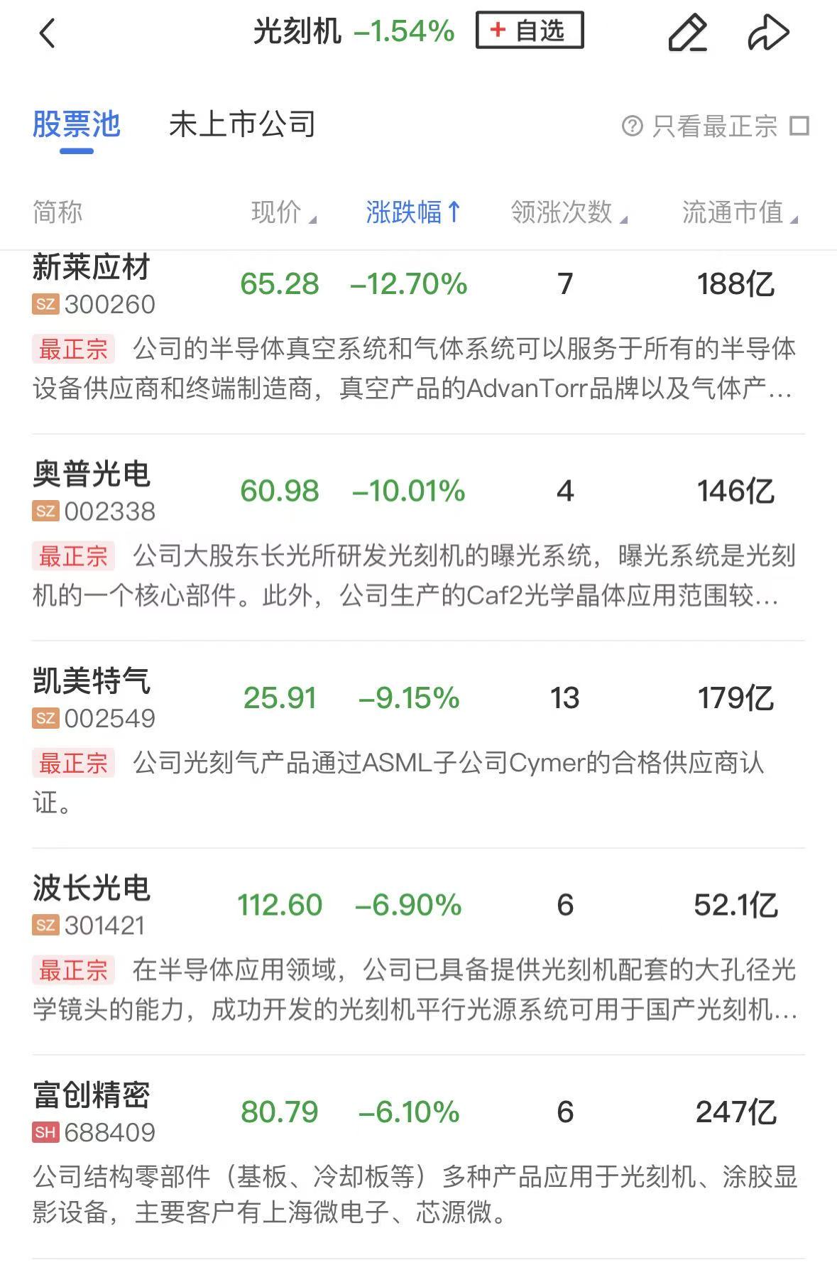 光刻机概念股全线调整,新莱应材、利和兴跌超10%,奥普光电跌停,国林科技、凯美特气、波长光电、华特气体跌幅居前。