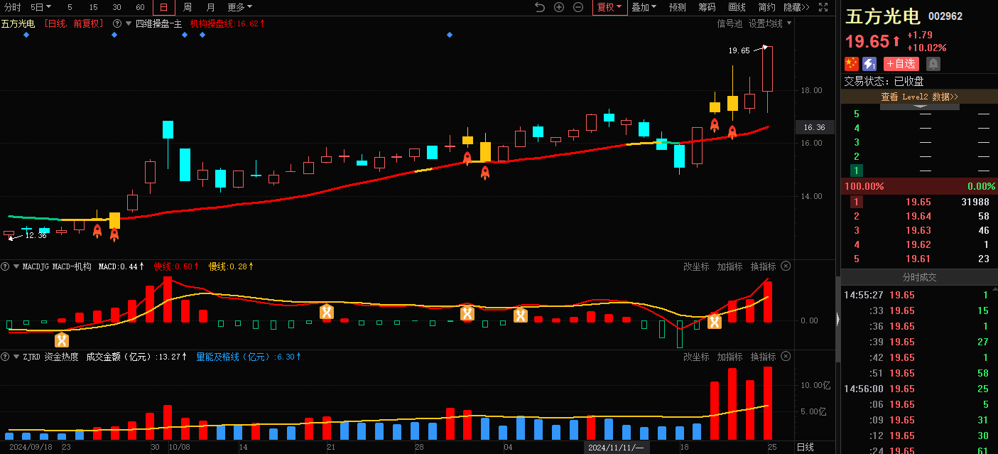 五方光电-四维操盘指标-均线呈红色,且出现火箭图标