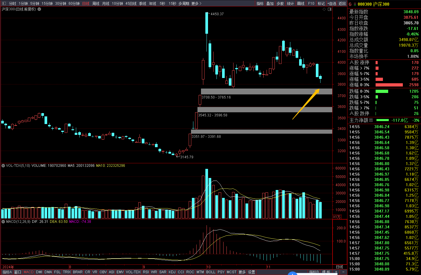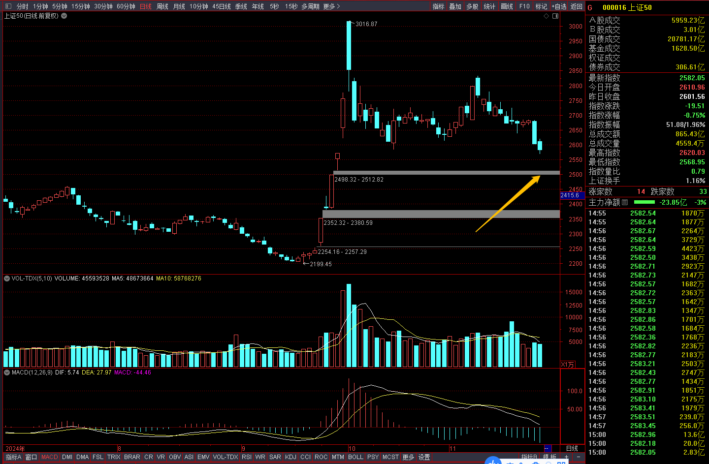 今天砸盘的主要是以上证50成分为主的权重股,目前几个宽基指数只有上证50破了10月18日的止跌大阳线,一般这几个指数有一个先后顺序关系,上证50破新低,其他几个会不会跟随?这个问题也是要注意的。