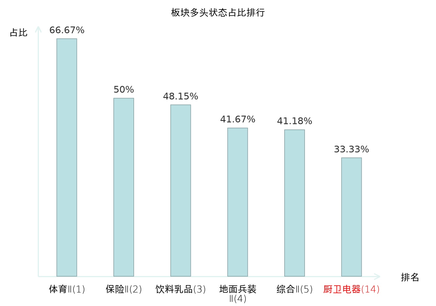 全市场所有行业板块中主力多头状态占比排名中,体育Ⅱ板块位居第一。种植业板块名次提升最快,较昨日上升70位。