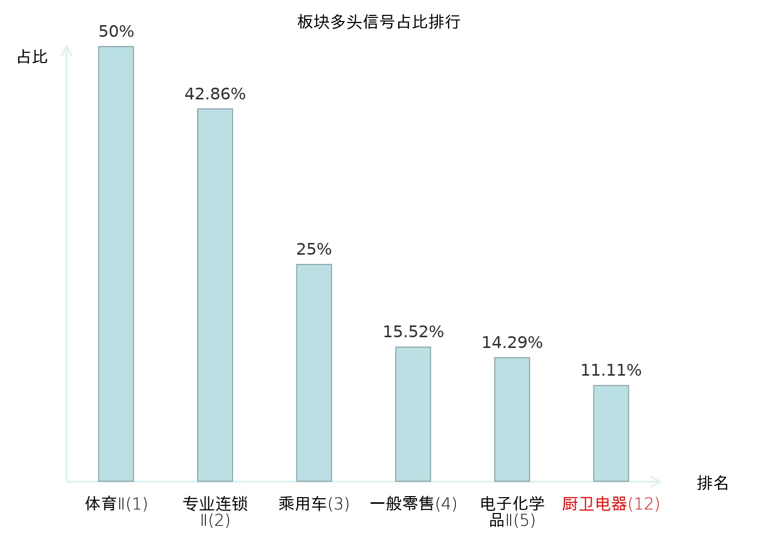 全市场所有行业板块中主力多头信号占比排名中,体育Ⅱ板块位居第一。体育Ⅱ板块名次提升最快,较昨日上升129位。