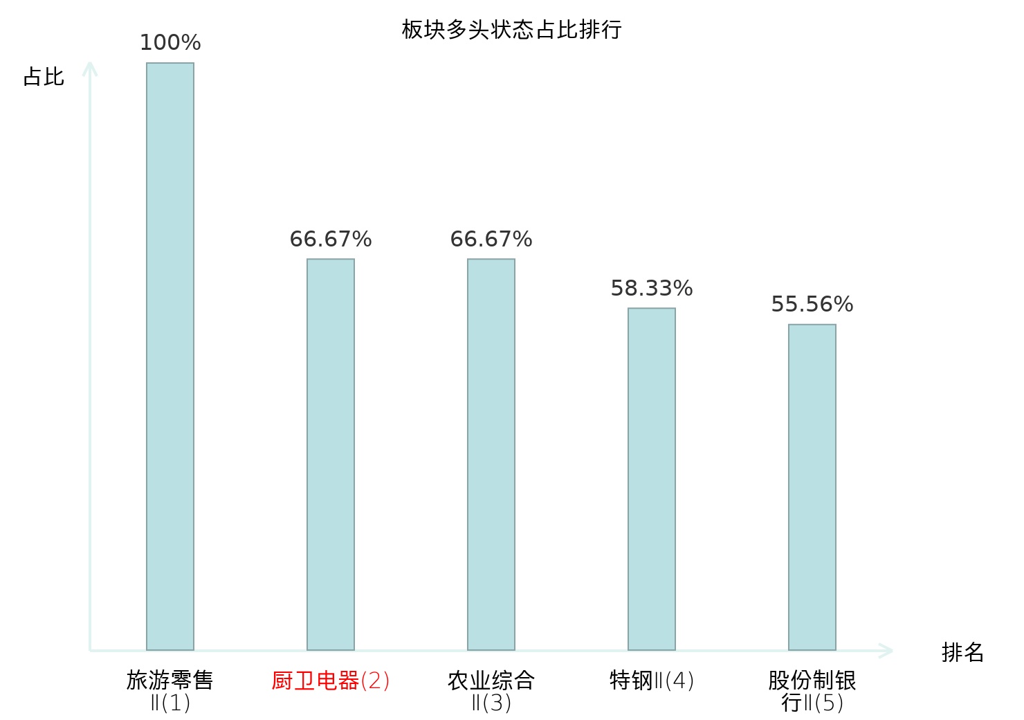 全市场所有行业板块中主力多头状态占比排名中,旅游零售Ⅱ板块位居第一。农商行Ⅱ板块名次提升最快,较昨日上升78位。