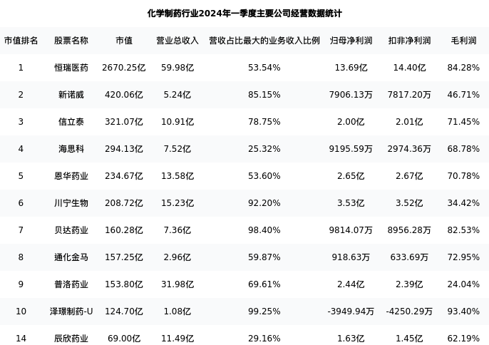 辰欣药业最新报告期数据为一季度,下表汇总了化学制药行业内市值靠前的公司一季度主要经营数据