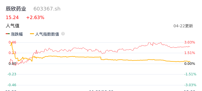 04月22日,辰欣药业收报15.24,股价涨幅2.63%,成交金额6483.43万元,换手率0.95%。