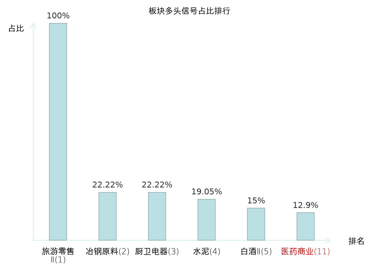 全市场所有行业板块中主力多头信号占比排名中,旅游零售Ⅱ板块位居第一。旅游零售Ⅱ板块名次提升最快,较昨日上升130位。