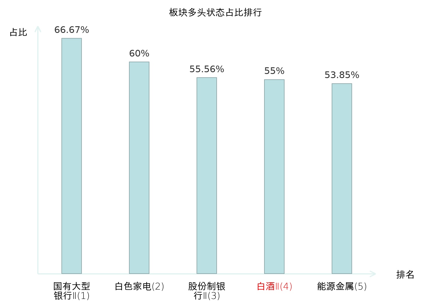 全市场所有行业板块中主力多头状态占比排名中,国有大型银行Ⅱ板块位居第一。林业Ⅱ板块名次提升最快,较昨日上升99位。