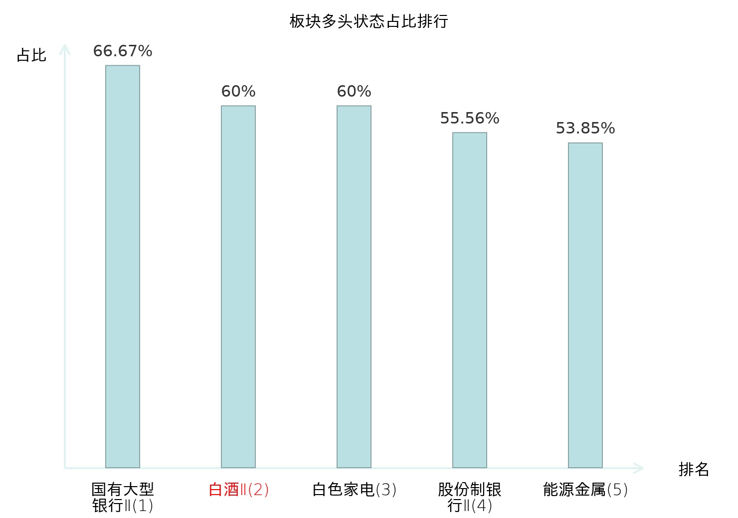 全市场所有行业板块中主力多头状态占比排名中,国有大型银行Ⅱ板块位居第一。电子化学品Ⅱ板块名次提升最快,较昨日上升55位。
