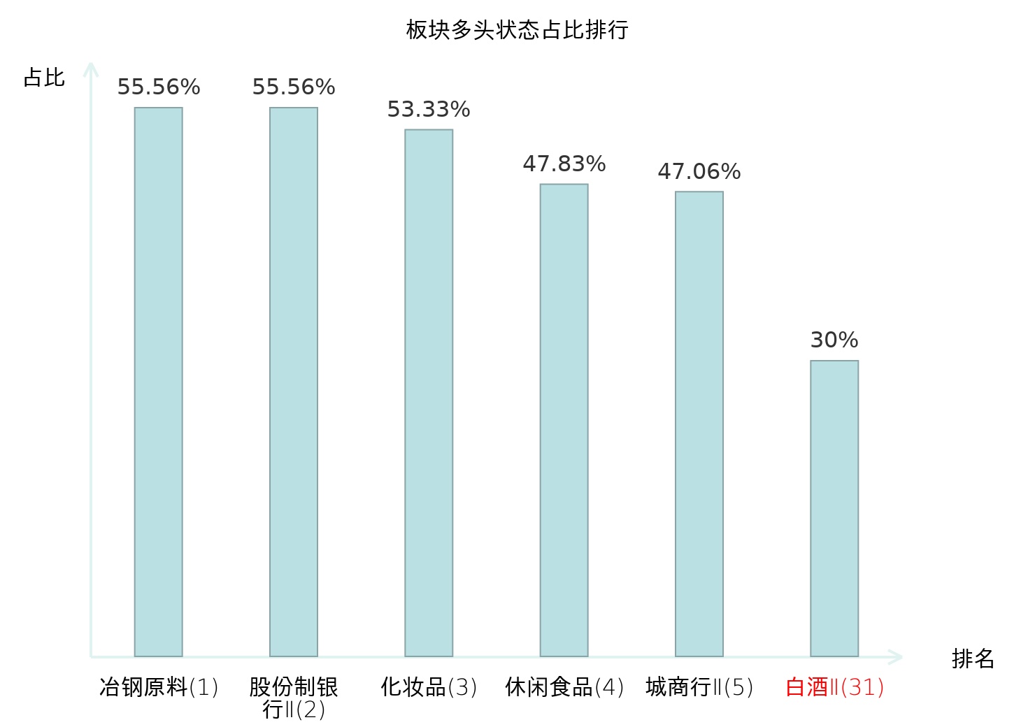 全市场所有行业板块中主力多头状态占比排名中,冶钢原料板块位居第一。其他家电Ⅱ板块名次提升最快,较昨日上升105位。