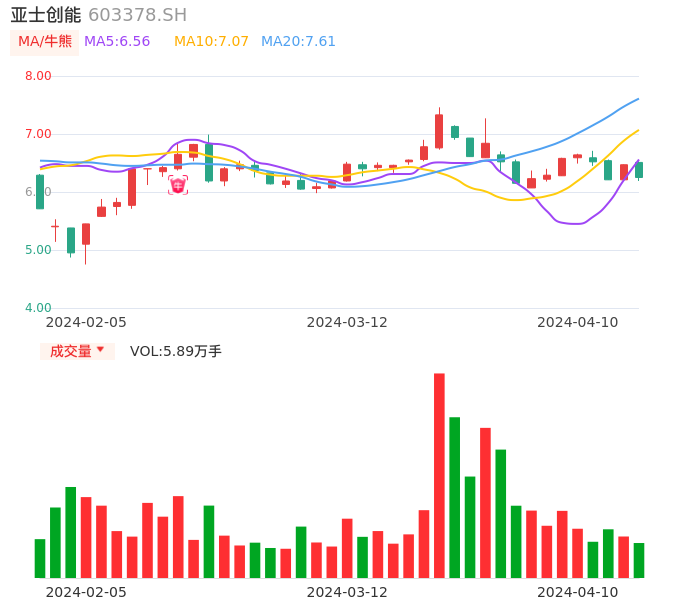 04月10日,亚士创能收报6.25,股价涨幅-3.40%,成交金额3701.26万元,换手率1.37%。