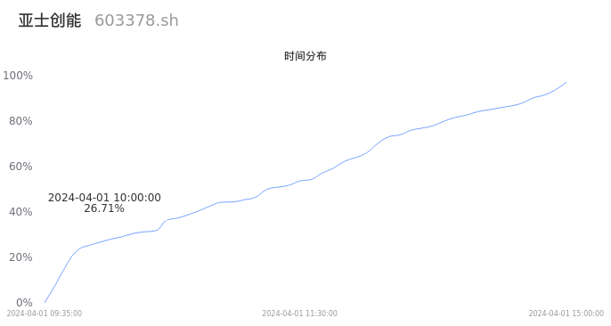 603378亚士创能2024年04月01日成交11.30万手,成交金额7331.58万元,相较昨日放量2.51万手,换手率2.64%,成交清淡。