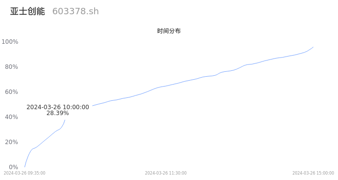 603378亚士创能2024年03月26日成交21.60万手,成交金额1.41亿元,相较昨日缩量3.66万手,换手率5.04%,成交清淡。