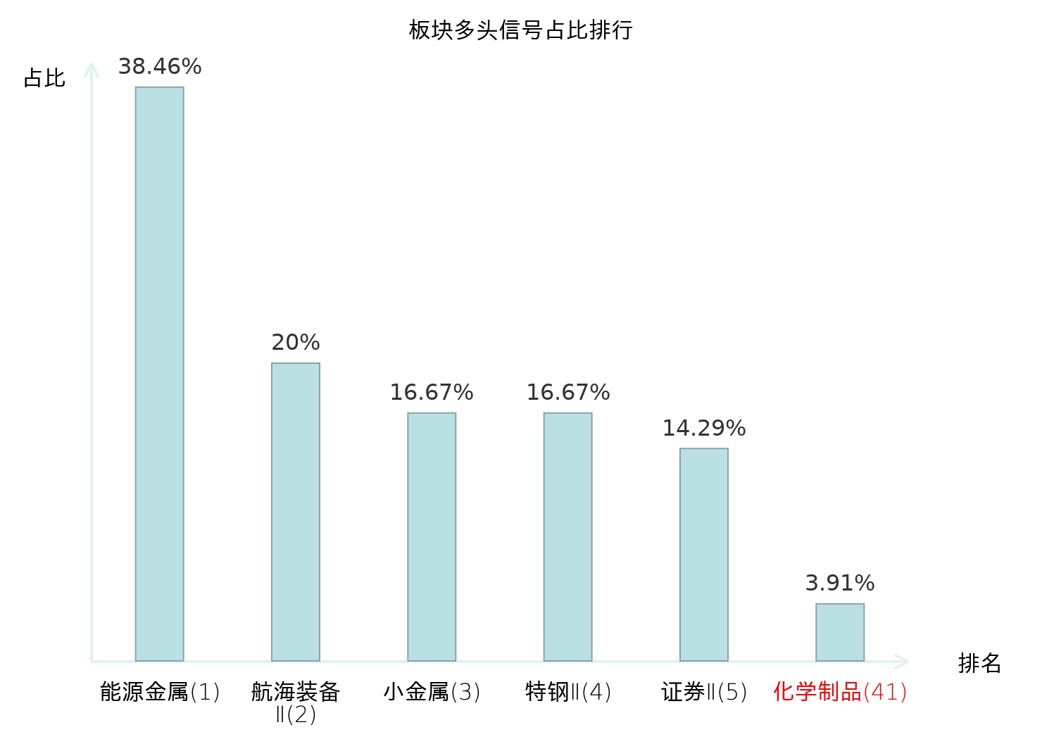 全市场所有行业板块中主力多头信号占比排名中,能源金属板块位居第一。航海装备Ⅱ板块名次提升最快,较昨日上升112位。