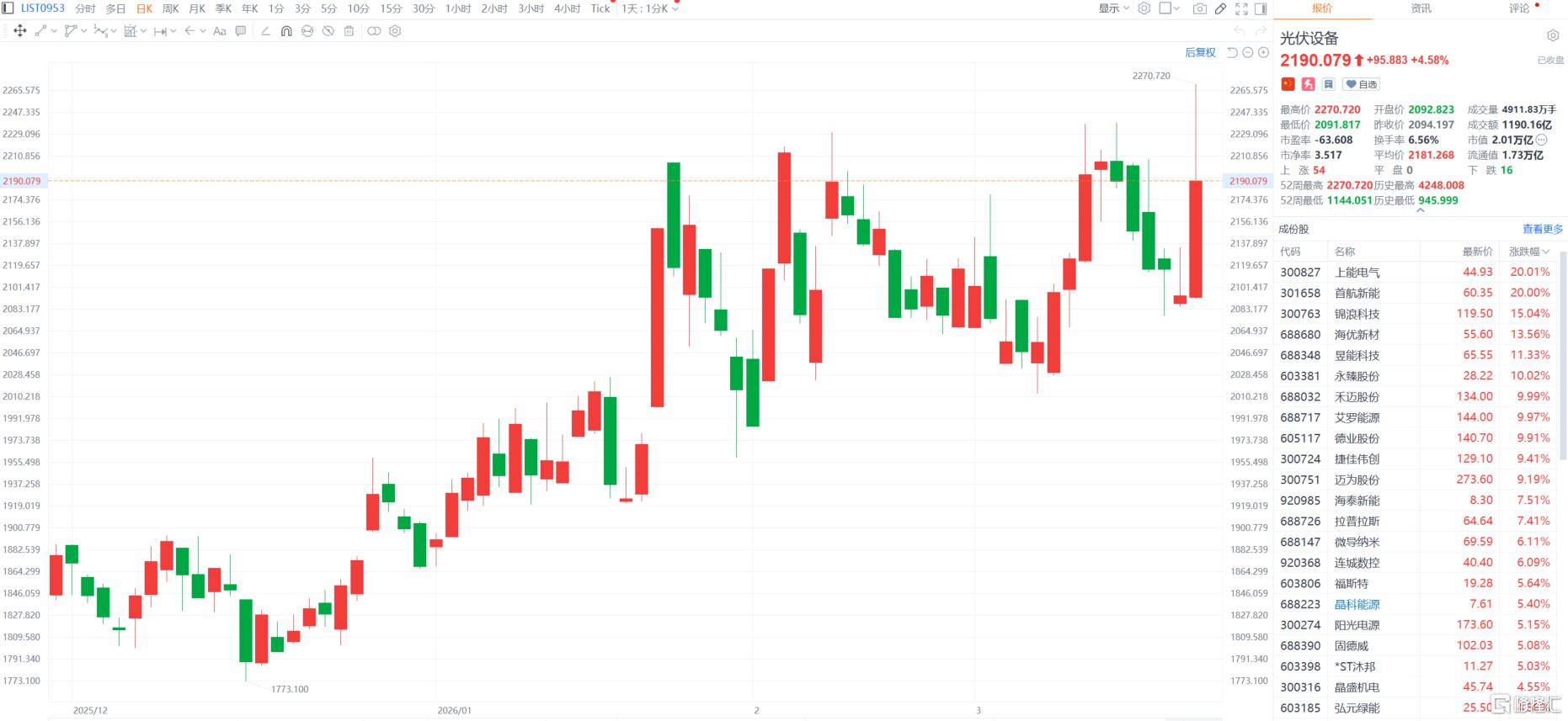 截止收盘,A股上能电气、首航新能、永臻股份涨停,正泰电源8天4板,国晟科技14天6板。阳光电源、晶科能源涨超5%。