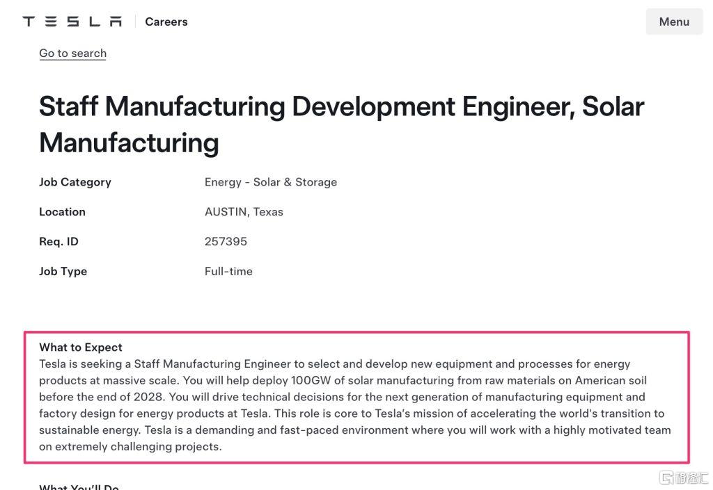 特斯拉招聘信息:太阳能制造部门高级制造开发工程师