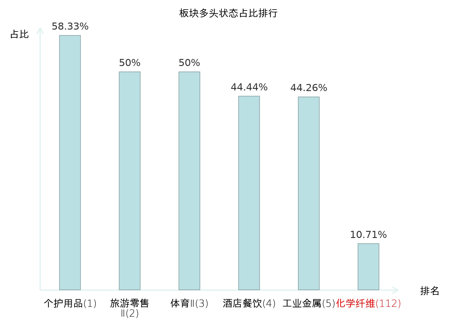 全市场所有行业板块中主力多头状态占比排名中,个护用品板块位居第一。非白酒板块名次提升最快,较昨日上升65位。