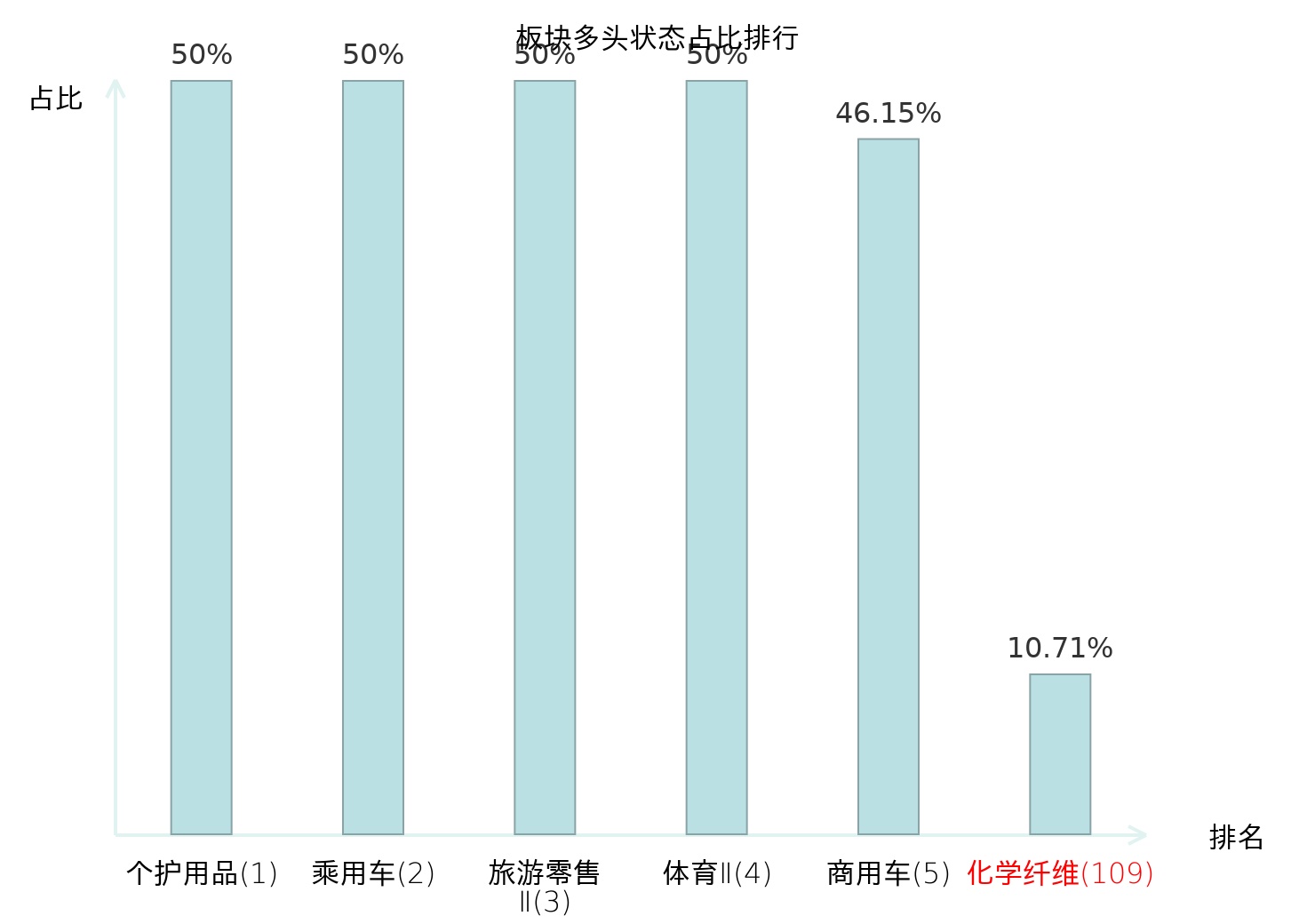 全市场所有行业板块中主力多头状态占比排名中,个护用品板块位居第一。林业Ⅱ板块名次提升最快,较昨日上升94位。