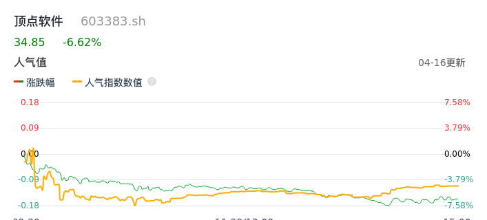 04月16日,顶点软件收报34.85,股价涨幅-6.62%,成交金额2.46亿元,换手率4.09%。