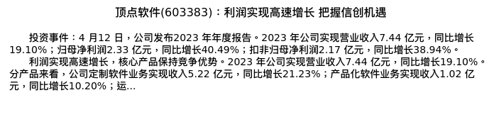 值得注意的是:2024年04月中泰证券的闻学臣分析师,首次发布关于顶点软件的研究报告,标题为:顶点软件(603383):利润实现高速增长 把握信创机遇。