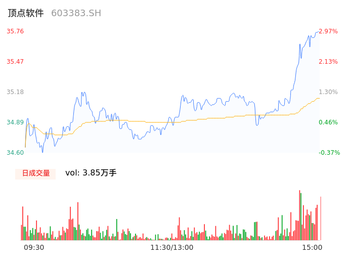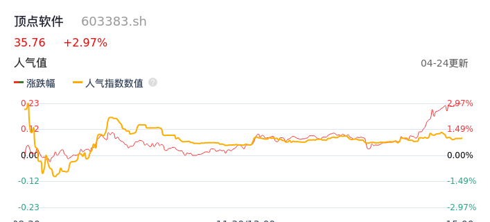 04月24日,顶点软件收报35.76,股价涨幅2.97%,成交金额1.35亿元,换手率2.27%。