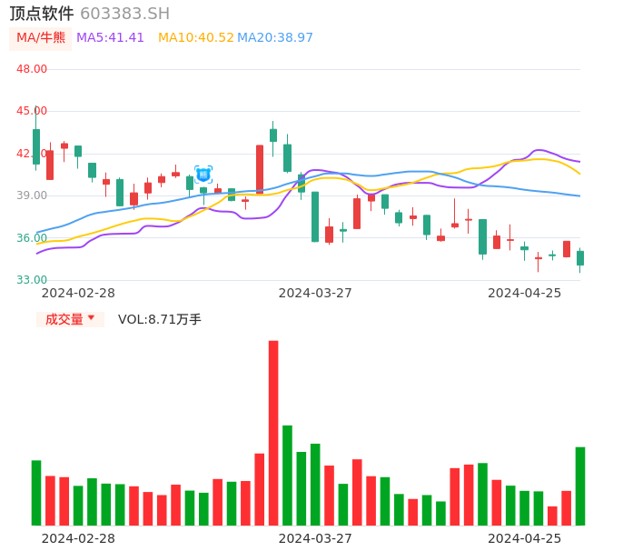 04月25日,顶点软件收报34.06,股价涨幅-4.75%,成交金额3.00亿元,换手率5.14%。