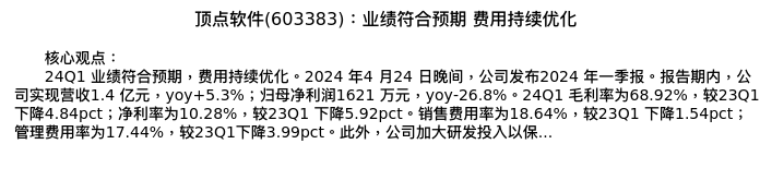 值得注意的是:2024年04月广发证券的刘雪峰/李婉云分析师,首次发布关于顶点软件的研究报告,标题为:顶点软件(603383):业绩符合预期 费用持续优化。