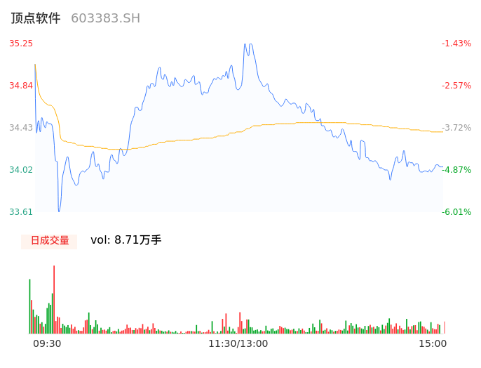 04月25日,顶点软件收报34.06,股价涨幅-4.75%,成交金额3.00亿元,换手率5.14%。
