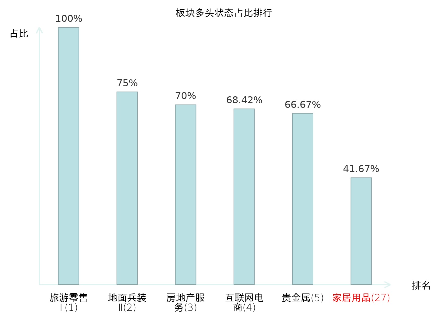 全市场所有行业板块中主力多头状态占比排名中,旅游零售Ⅱ板块位居第一。白色家电板块名次提升最快,较昨日上升65位。