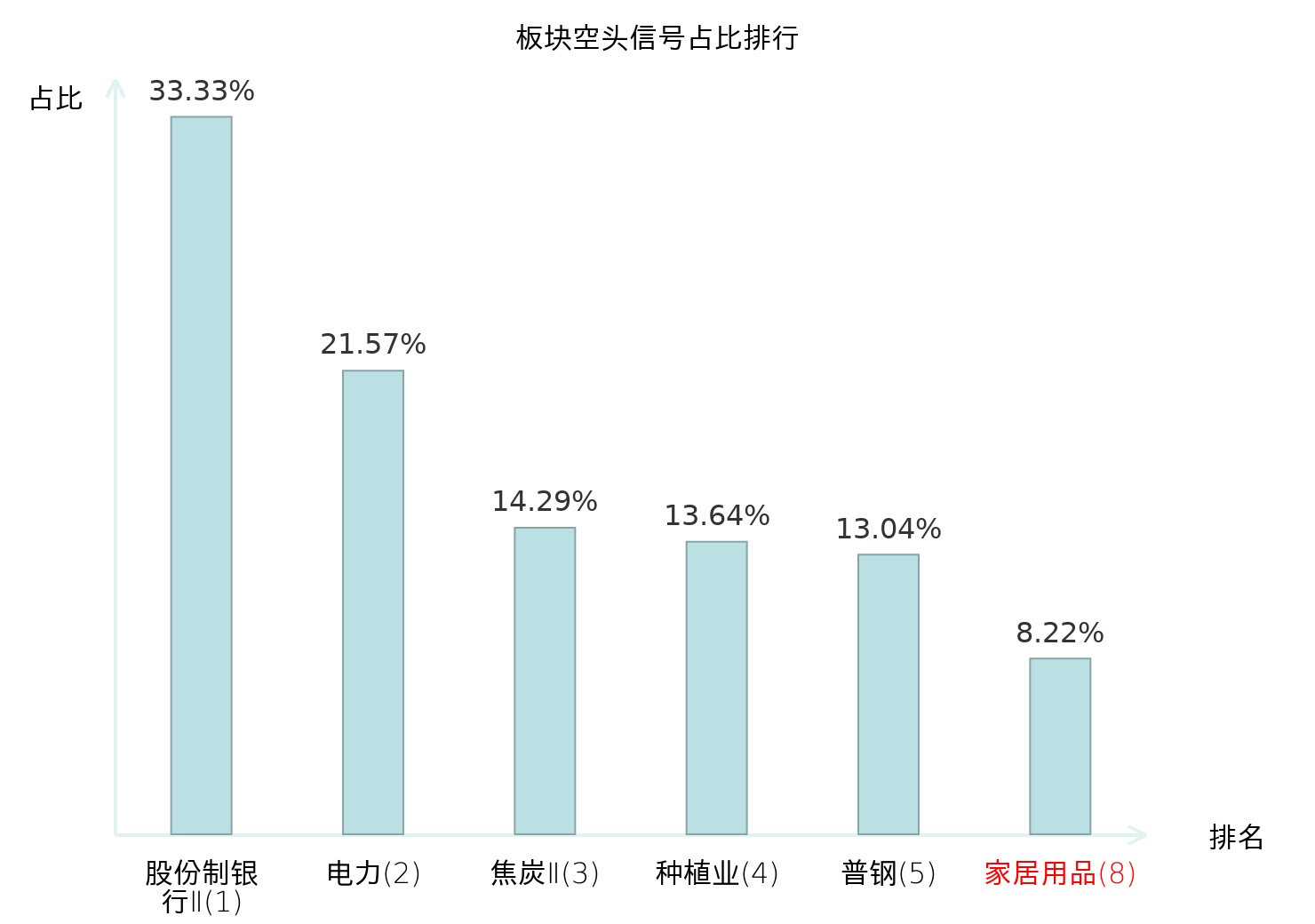 全市场所有行业板块中主力空头信号占比排名中,股份制银行Ⅱ板块位居第一。家居用品板块名次提升最快,较昨日上升120位。