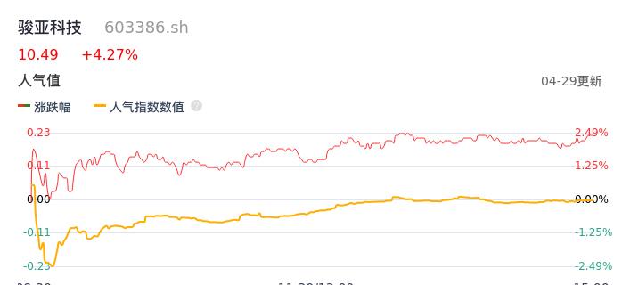 04月29日,骏亚科技收报10.49,股价涨幅4.27%,成交金额4397.30万元,换手率1.32%。