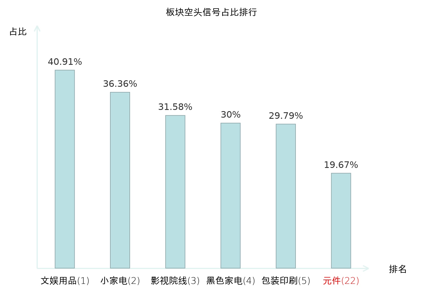 全市场所有行业板块中主力空头信号占比排名中,文娱用品板块位居第一。包装印刷板块名次提升最快,较昨日上升124位。