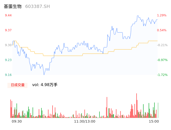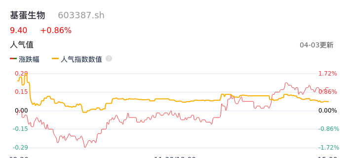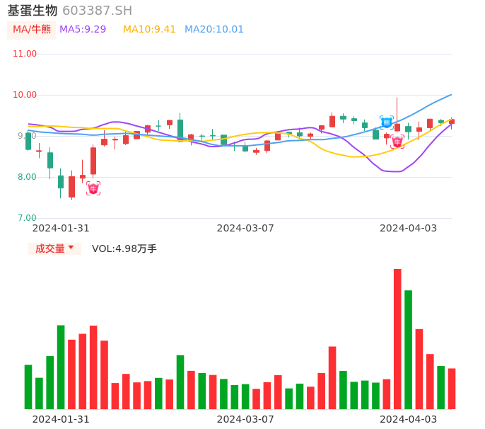 04月03日,基蛋生物收报9.40,股价涨幅0.86%,成交金额4642.45万元,换手率0.98%。